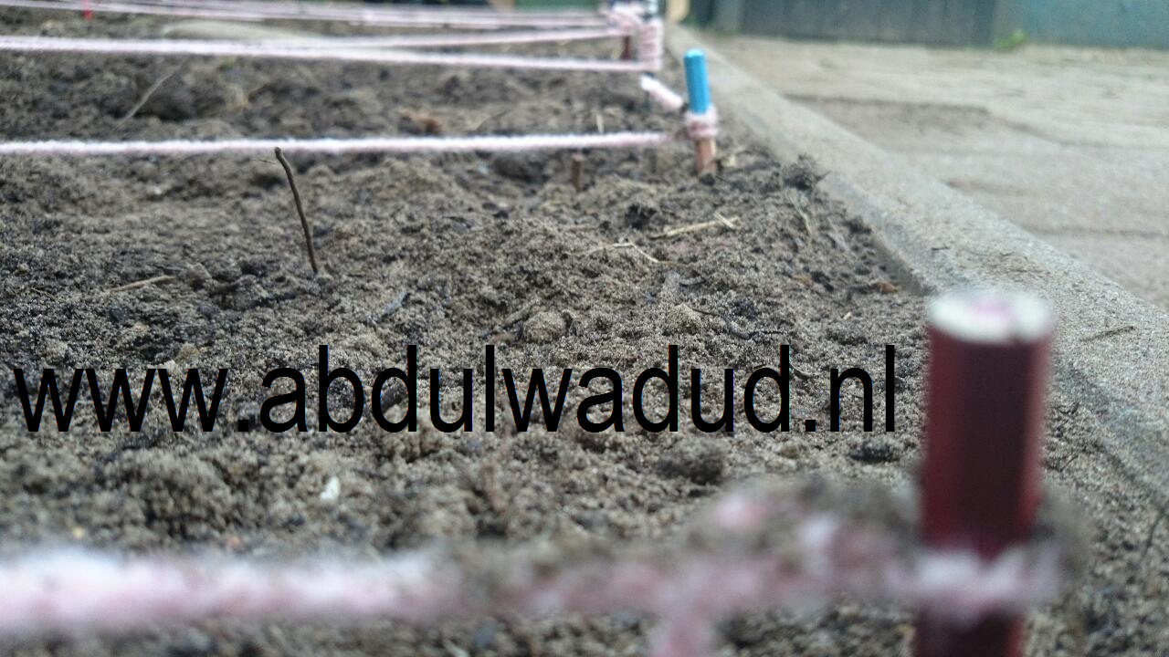 Vanmiddag wat bemeste tuinaarde gehaald en mijn mini-moestuin omgespit, vervolgens de tuinaarde toegevoegd en wortels gezaaid. Ik had niet gedacht aan het markeren van de zaaigeulen, maar alhamdulillah heeft mijn dochter Kiné daar een oplossing voor: potloden en roze wol. Creatief hoor :-)