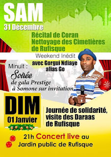 Het nieuwjaar wordt geopend om middernacht met een gala, overdag staat de solidariteit centraal en 's avonds om 21.00 uur geeft Gorgui Ndiaye (wereldberoemd in Rufisque) een concert in het Jardin public.